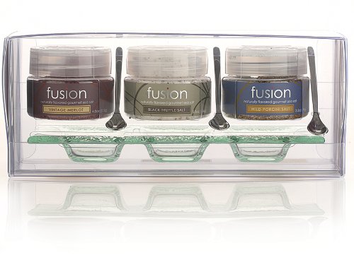 The Fusion Exquisite Taste Trio is a fun, delicious way to give the gift of flavor! Colorful and eye-catching, this brand new set features three of our favorite rich and savory Fusion salts. Each set includes a selection of three full-size Fusion All Natural flavored sea salts, a glass serving tray, and three stainless steel salt spoons.
