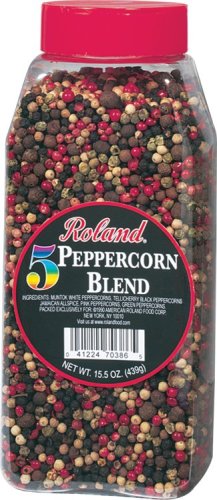 Roland Five Peppercorn blend is a blend of five colorful whole spices: green, pink, white, and black peppercorns, and Jamaican all spice The product is packed in a 16 oz package for foodservice